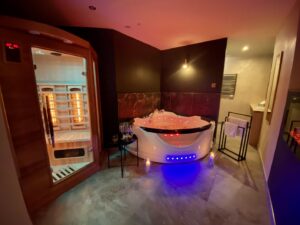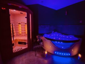• mini spa: dwuosobowa wanna z hydromasażem (trzeba nalać wody), dwuosobowa sauną na podczerwień, TV, kominek elektryczny (wyłącznie efekt wizualny)