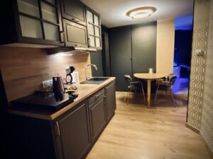 • kuchnia: stół 2 osobowy, płyta dwupalnikowa, lodówka z zamrażalnikiem, czajnik bezprzewodowy, naczynia, sztućce, garnki, mikrofalówka na życzenie – wejście z przedpokoju