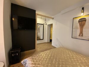 • sypialnia: łózko 160 cm, szafa, TV, stelaż do huśtawki – wejście z przedpokoju