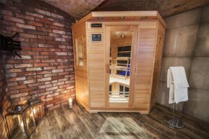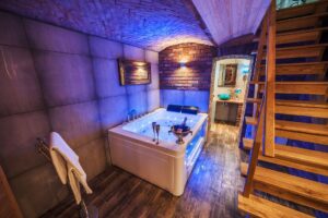 - mini spa: jacuzzi – dwuosobowa wanna z hydromasażem (trzeba nalać wody), dwuosobowa sauną na podczerwień, zejście schodami z saloniku