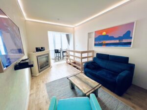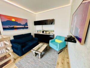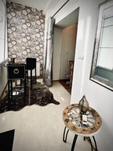 - Salonu z aneksem: rozkładana kanapa, TV, kominek elektryczny, stolik kawowy – wejście z werandy, schody do do mini spa oraz łazienki